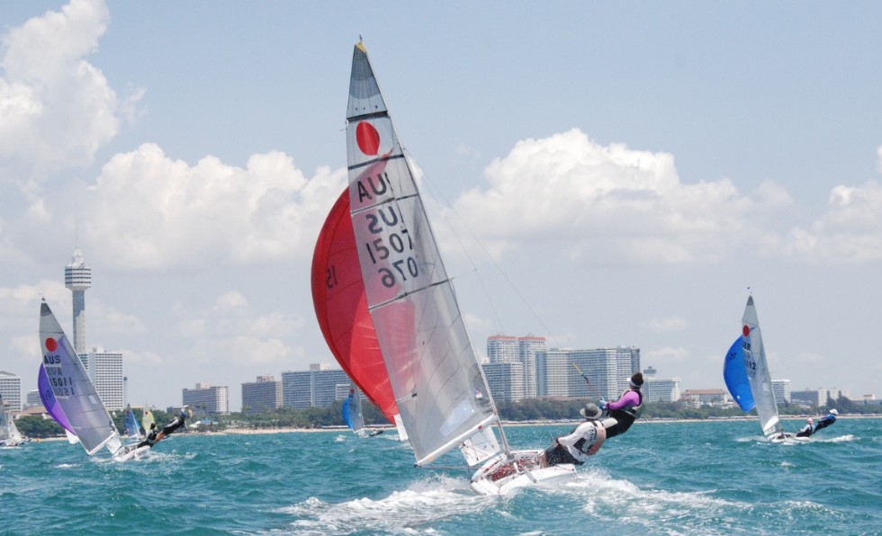 It was a tricky day on the water in Pattaya for the first races of the 2014 Pre-worlds. With the breeze in the north west and a forecast swing to the south west the only question was when it would happen. The fleet headed out for a 1pm start in 8 knots, a short chop and a strong outgoing tide. After a short postponement racing got under way with the left side appearing favoured. For those who went this way things started to look pretty ordinary half way up the beat when the pressure dropped and the boats on the right moved forward. All was not lost though as the breeze came up again and the fleet coming back together. It was Nathan Bachelor and Sam Pascoe who held out on the right to round the top mark first, followed by Heather McFarlane and Chris Payne who had come from the left. These two would hold their positions throughout the race to finish first and second respectively. Veronica and Ben Felat sailed well to round in third and only fell back to forth when hot favourites Christian Birrell and Sam Brearey picked some nice shifts to sneak up through the fleet. The talking point at the bar tonight will be the 40 degree wind shift to the left on the second lap which resulted in a change of the course and a number of position changes in the middle of the fleet. Mike Rogers and his team did extremely well to swing the course mid race and ensure that racing remained fair. The start of race two was held up by a breeze struggling to settle into the new south westerly direction. The changing conditions made it had for PRO Mike to set a line and as a result the fleet kept pushing too hard. After six general recalls and four line changes the fleet finally managed to get away. Numbers were on the low side as a number of boats could hear the bar calling and headed for shore. The reduced fleet raced towards the top mark with a split between the left and the right. Those on the right came out best with the Swiss couple of Christine and Cedric Landerer rounding in front followed by Heather McFarlane and Chris Payne then Veronica and Ben Felat rounding out the top three as all women helms. The racing at the front was tight with Heather and Chris sialing to a narrow win followed by the Felats and Ben Schulz and Doug Sheppard. Heather was spotted at the bar later drinking Margaritas to celebrate a near perfect start to the regatta. Veronica and Ben have sailed extremely well to sit in second and Ben and Doug who only came together for their first races today rounding out the top three. The forecast for tomorrow is a south westerly breeze in the low teens and then building as the week goes on so stay tuned for some exciting racing over the coming days. |